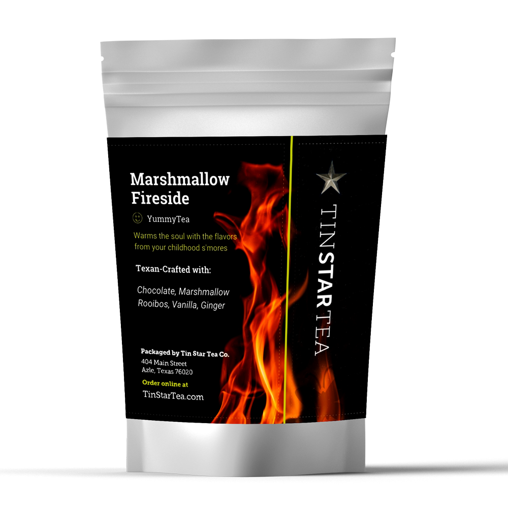 Smoke Fired Black Tea, Russian Caravan, Cocoa Nibs, Vanilla, Cinnamon, Allspice, Ginger, Marshmallow and root, Safflower, Rooibos, and natural flavors.
