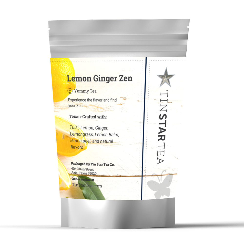 Tulsi, Lemon, Ginger, Lemongrass, Lemon Balm, lemon peel, and natural flavors.