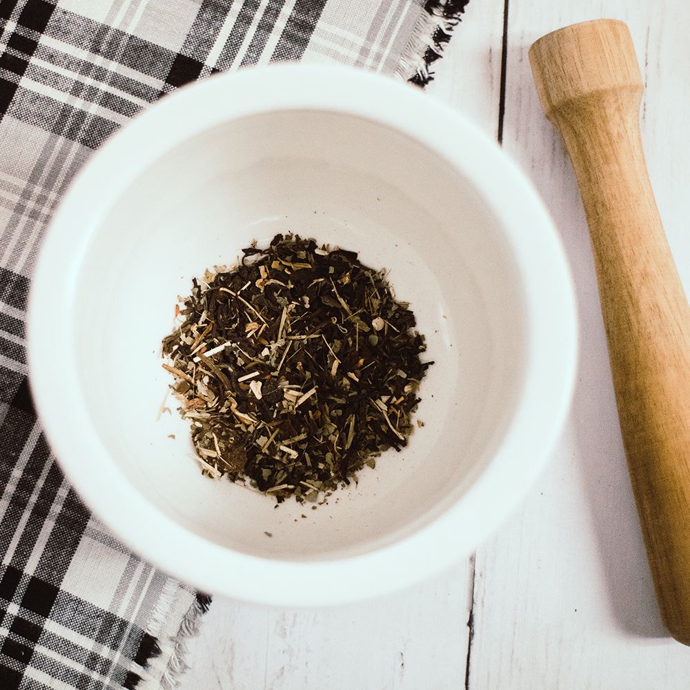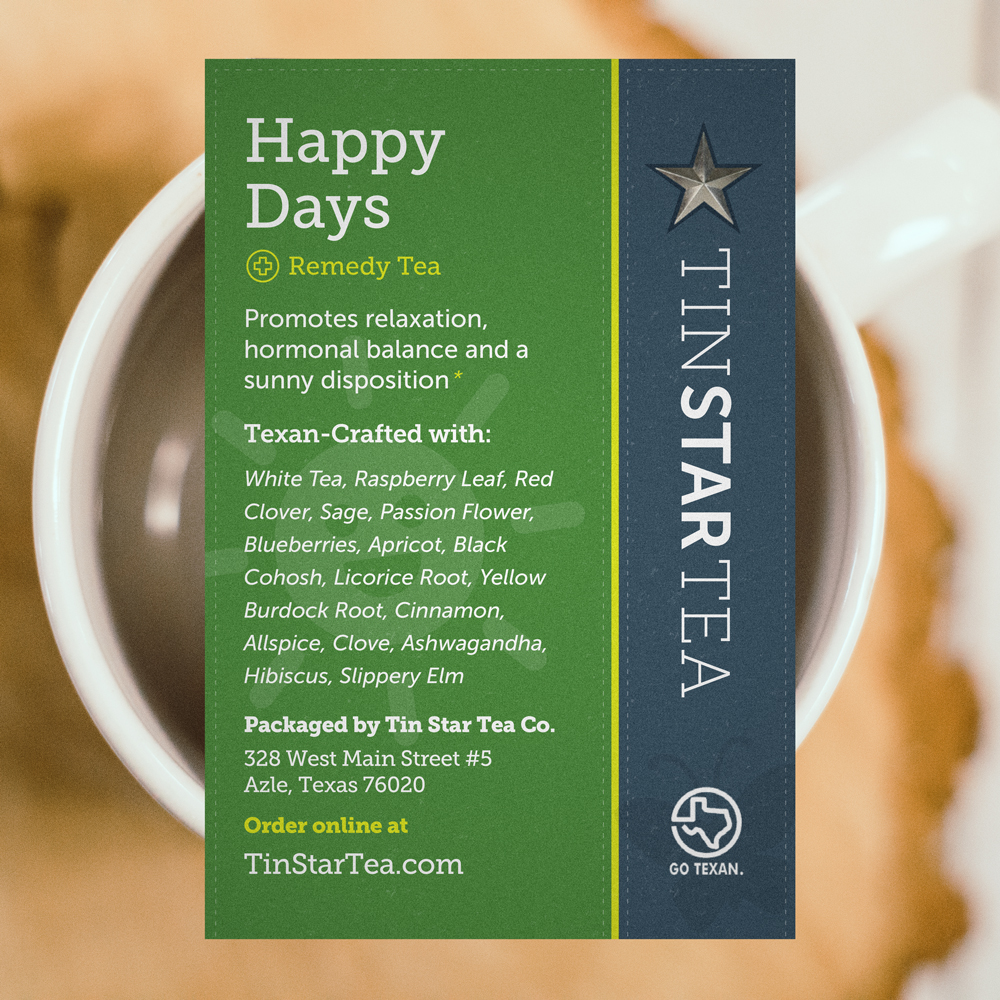 White Tea, Raspberry Leaf, Red Clover, Black Cohosh, Sage, Passion Flower, Blueberries, Apricot, Licorice Root, Cinnamon, Allspice, Clove, Ashwagandha, Hibiscus, Slippery Elm, Maca Root, and natural flavorings.